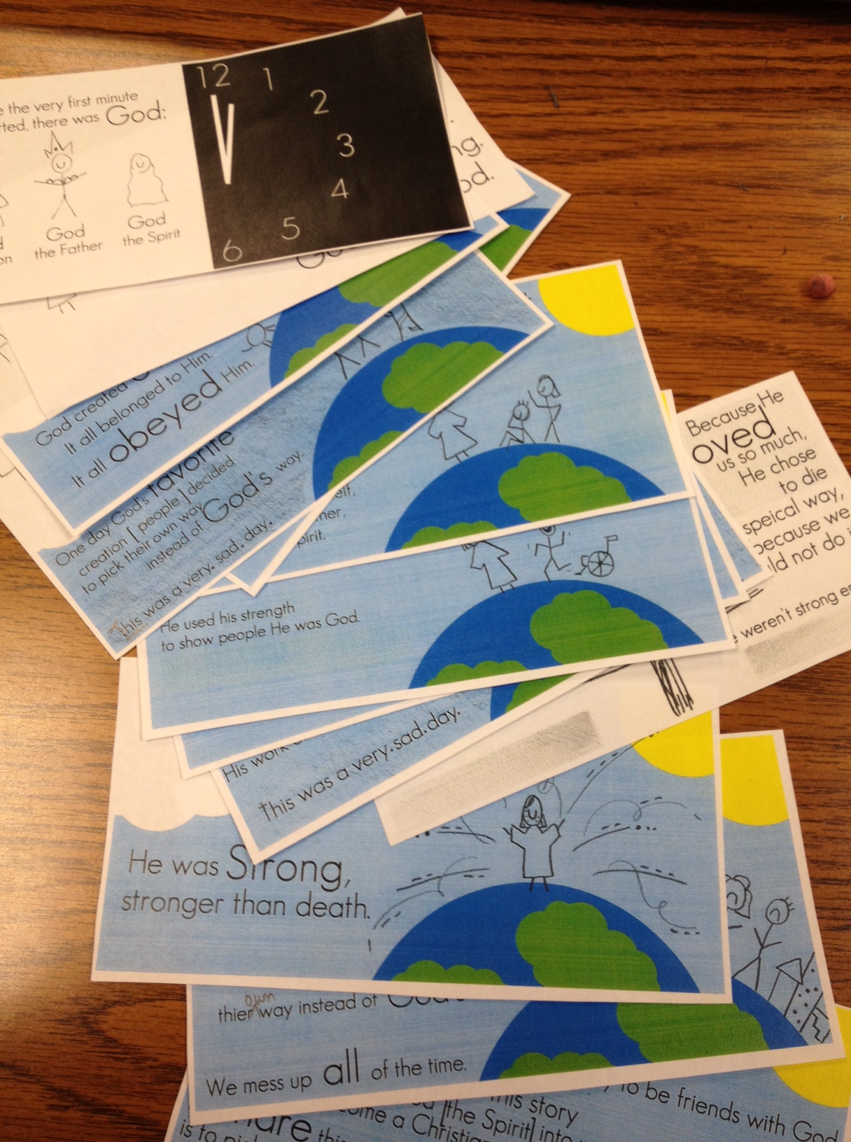 I stumbled around in my mind for a minute, trying to convince myself that I wasn’t slacking as hard as I thought I was…then broke out into the ABC’s. You know…A (admit you are a sinner)…B (believe that His love will save you)…C (Confess that Jesus is Lord.) Lame-O. Don’t get me wrong…it’s usable I’ve used it many times. Do I think Jesus made it into those kids hearts? Yes. Do I think it’s more about the heart and mind of a child than the specific list or prayer they are led through? Yes.